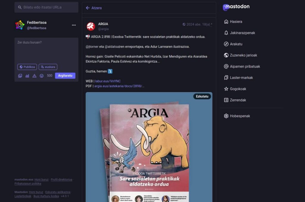 Aztertu konfigurazio-aukerak, non erabaki batzuk har ditzakezun itxurari, pribatutasunari eta abarri buruz. Garrantzitsua da, Mastodonek jende gehiagorengana iristea nahi baduzu: «Profila» > «Pribatutasuna eta irismena» atalean, markatu zure profila eta argitalpenak bilaketa-emaitzetan edo bilaketa-algoritmoetan agertzea nahi duzun.